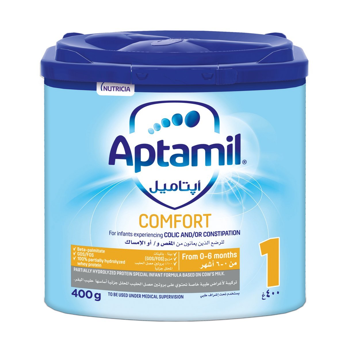 Aptamil Comfort 1 is formulated for the dietary management of colic and constipation. It is a nutritionally complete, formula containing blend of Galacto and Fructo oligosaccharides GOS/FOS, reduced lactose, partially hydrolysed protein, and a fat blend with beta palmitate. Aptamil Comfort 1 is suitable from birth to 6 months of age.