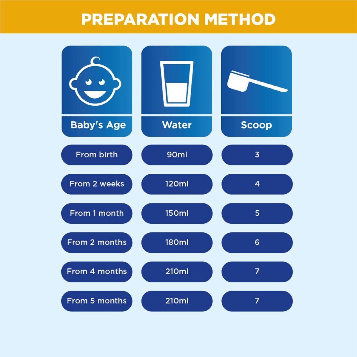 4. Always use the scoop provided. Level off the powder with the built-in leveller. Do not press extra powder into the scoop. Add the correct measure of powder to the water. Adding too many or too few scoops can be harmful to your baby. Cap the bottle and shake immediately vertically and vigorously for 10 seconds to dissolve powder. Remove seal and replace with sterilised teat. Check temperature on your wrist before feeding (37°C).