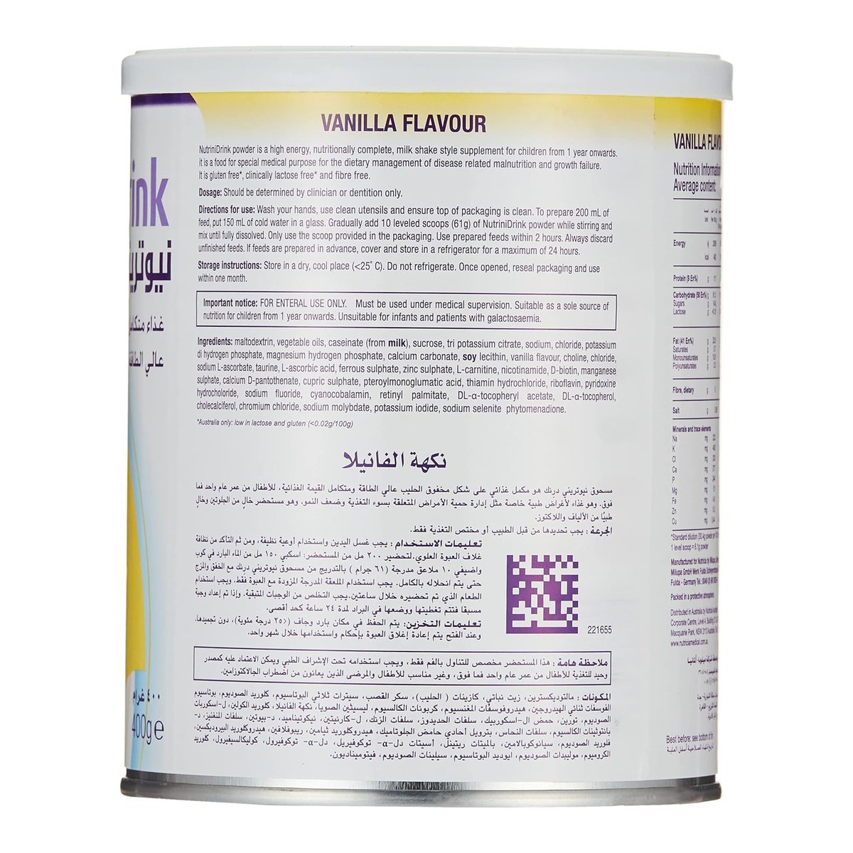 Aptamil Nutricia Nutrini Drink Vanilla Flavour is easy to incorporate into daily routines. It can be consumed on its own or mixed with other foods and beverages, providing flexibility for varied meal plans. Its convenient 400g packaging makes it easy to prepare and serve as needed.