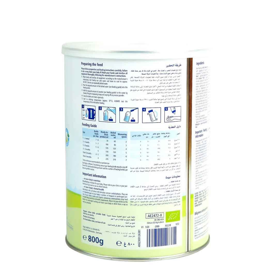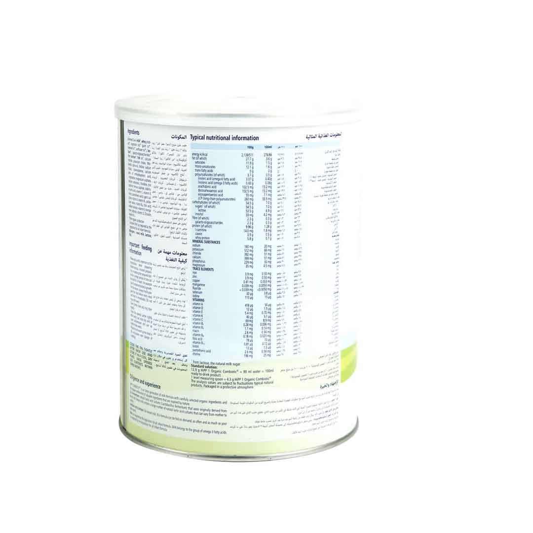 Organic skimmed milk (protein source: cow’s milk), organic demineralized whey powder (protein source: cow’s milk), organic vegetable oils (palm kernel oil, canola seed oil (not genetically modified), sunflower seed oil), prebiotic fiber (galactooligo-saccharides from lactose) (derived from cow’s milk), organic lactose (derived from cow’s milk), LCP* oils (fish, vegetable oils (mushroom oil)), calcium carbonate, emulsifier lecithin (soya), potassium chloride, L-tyrosine, L-phenylalanine, vitamin mix [vitamin C, vitamin E, vitamin A, nicotinic acid, pantothenic acid, thiamine (vitamin B1), vitamin B6, folic acid, riboflavin (vitamin B2), vitamin K, biotin, vitamin D, vitamin B12 (wheat)], magnesium carbonate, zinc sulfate, L-tryptophan, iron sulfate, stabilizer (L-lactic acid), copperlysine complex, potassium iodate, magnesium sulfate, sodium selenate.