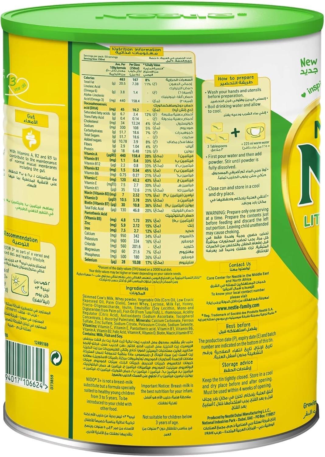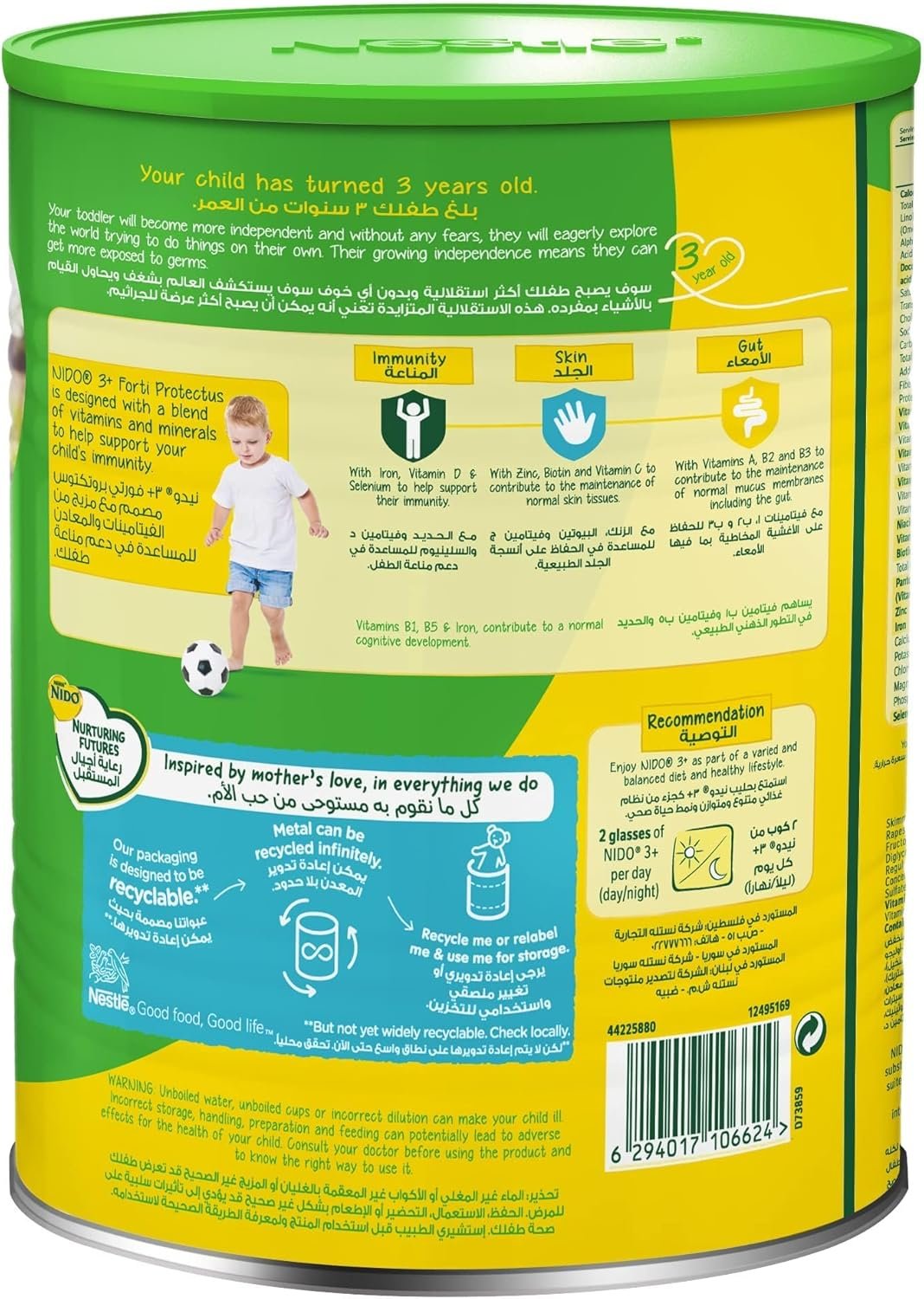 At this age, children become more active and curious, requiring a balanced intake of key nutrients to support their brain development, immune health, and physical growth. NIDO Three Plus is enriched with vital components like iron, zinc, vitamin C, vitamin D, and B-complex vitamins to promote a healthy immune system and cognitive function. It also includes Omega-3 fatty acids (DHA), which are crucial for brain and eye development.