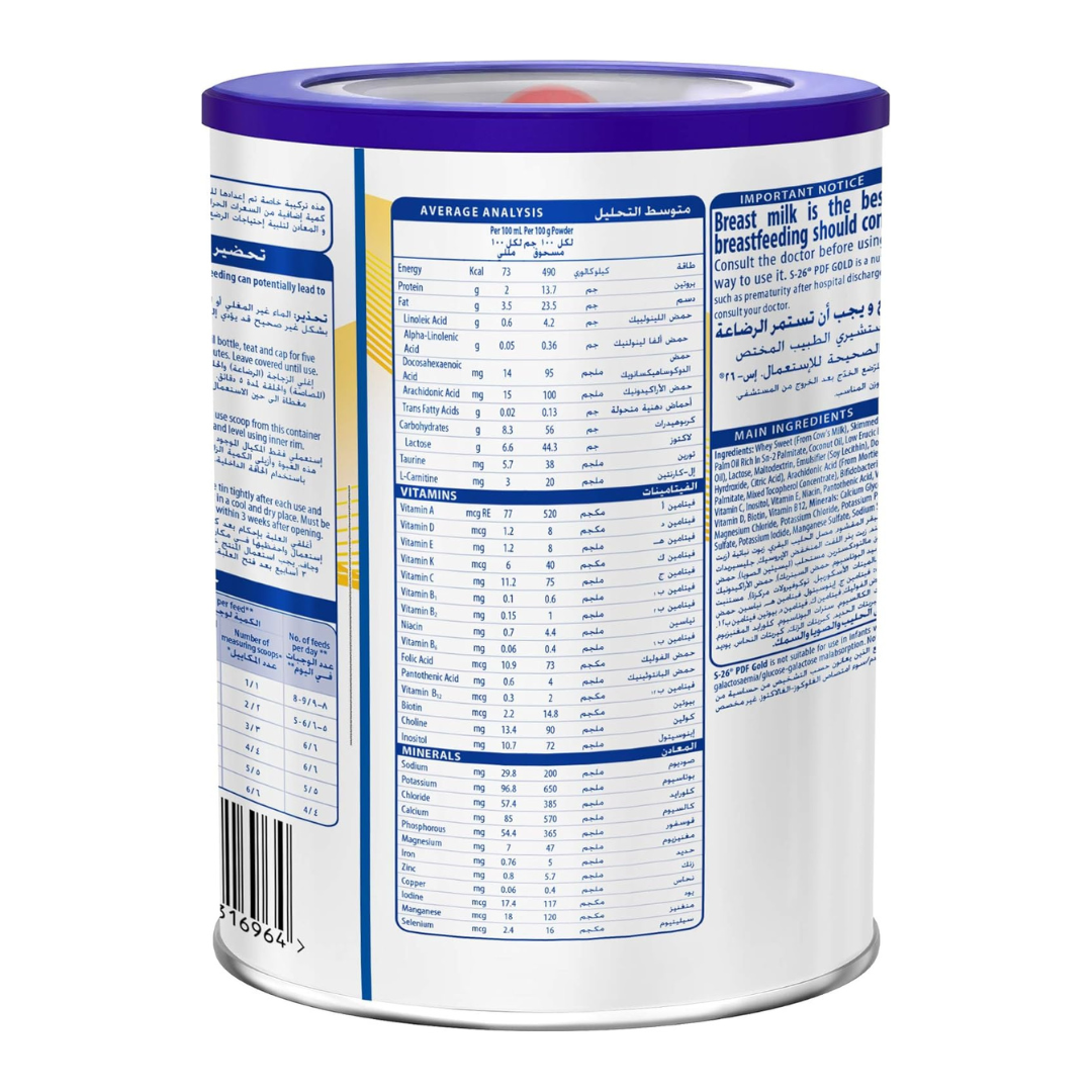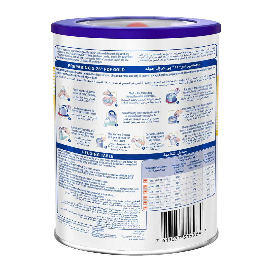 S-26 PDF Gold Formula Milk Powder is a specialized post-discharge formula tailored for preterm or low birth weight infants who have been discharged from the hospital but still need enhanced nutritional support to catch up on growth and development. It is formulated with higher levels of protein, energy, vitamins, and minerals compared to standard infant formulas, providing essential nutrients to support healthy physical and cognitive development.