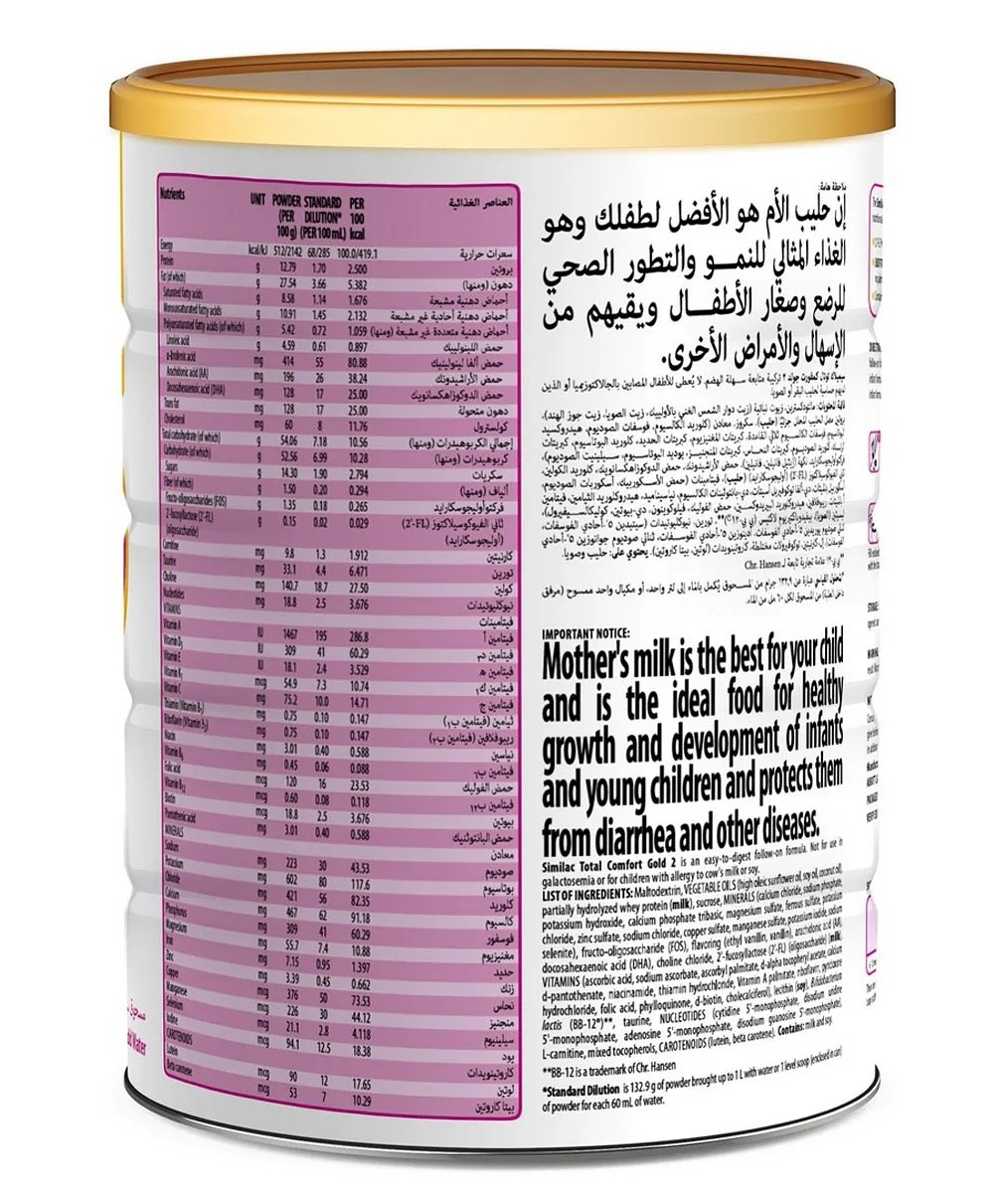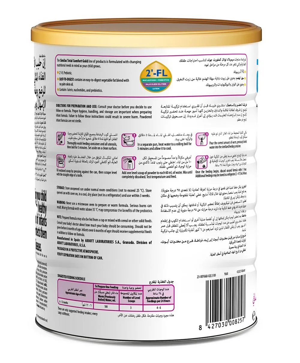 Proper hygiene, handling, and storage are important when preparing infant formula. Failure to follow these instructions could result in severe harm. Powdered infant formulas are not sterile and should not be fed to premature infants or infants who might have immune problems unless directed and supervised by your baby’s doctor. Use water that has previously been heated at a full rolling boil for 5 minutes. Allow the water to cool and follow mixing instructions carefully. Use only the scoop enclosed in this tin to measure Similac Total Comfort 2. If you prepare more than one feeding, it must be refrigerated at 2 – 4 °C and used within 24 hours. Once feeding begins, use within one hour or discard.